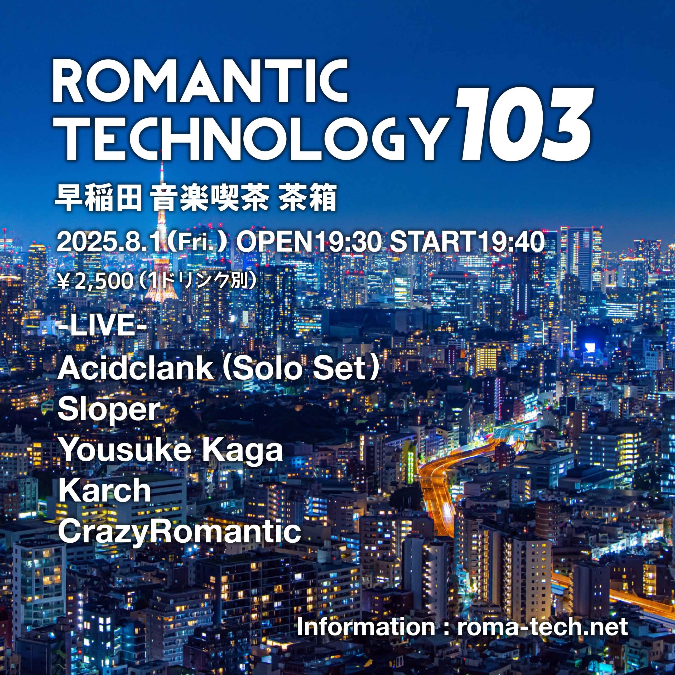 ROMANTIC TECHNOLOGY 103 2025/8/1(金) 早稲田 音楽喫茶 茶箱 OPEN 19:30 START 19:40 ¥2500(1ドリンク別) -LIVE- Acidclan ...